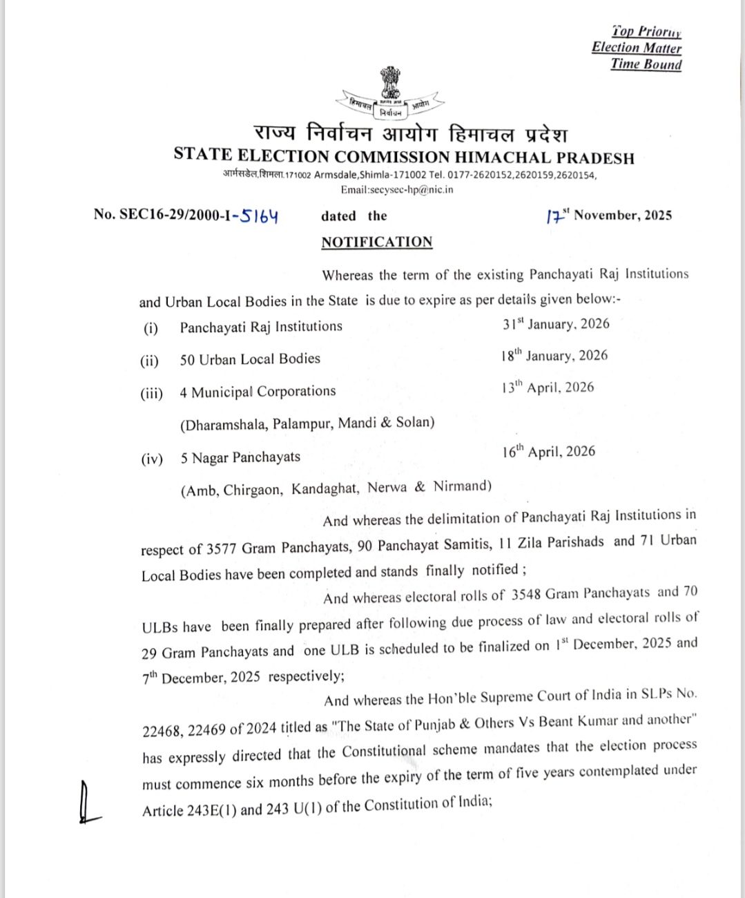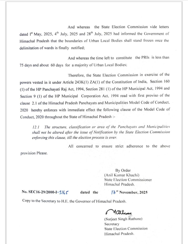 पंचायत चुनावों को लेकर बड़ी अपडेट: हिमाचल में अब नहीं होगा पंचायतों की सीमाओं में बदलाव, देखें  चुनाव आयोग की पंचायतों को लेकर जारी नई अधिसूचना
