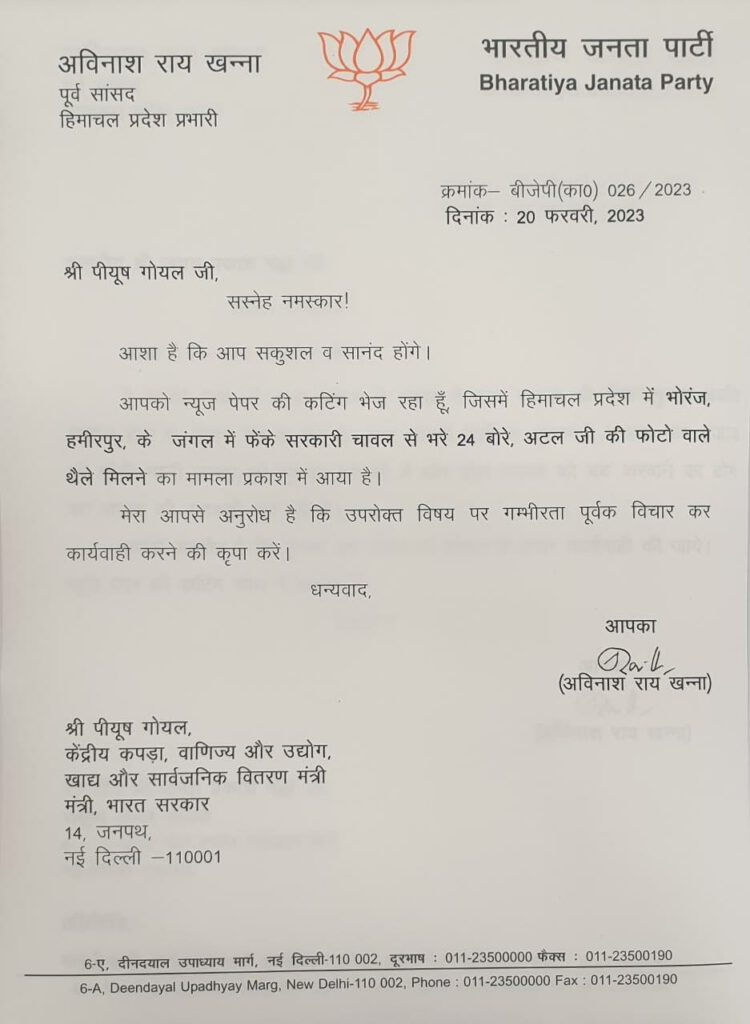 पत्र में अविनाश राय खन्ना ने पीयूष गोयल को अवगत करवाया कि भोरंज विधानसभा क्षेत्र जिला हमीरपुर के जंगल में फेंके सरकारी चावल से भरे 24 बोरी जिनपर पूर्व प्रधानमंत्री अटल बिहारी वाजपेई जी की फोटो लगी थी उसका मामला सामने आया है।