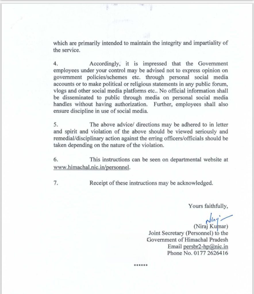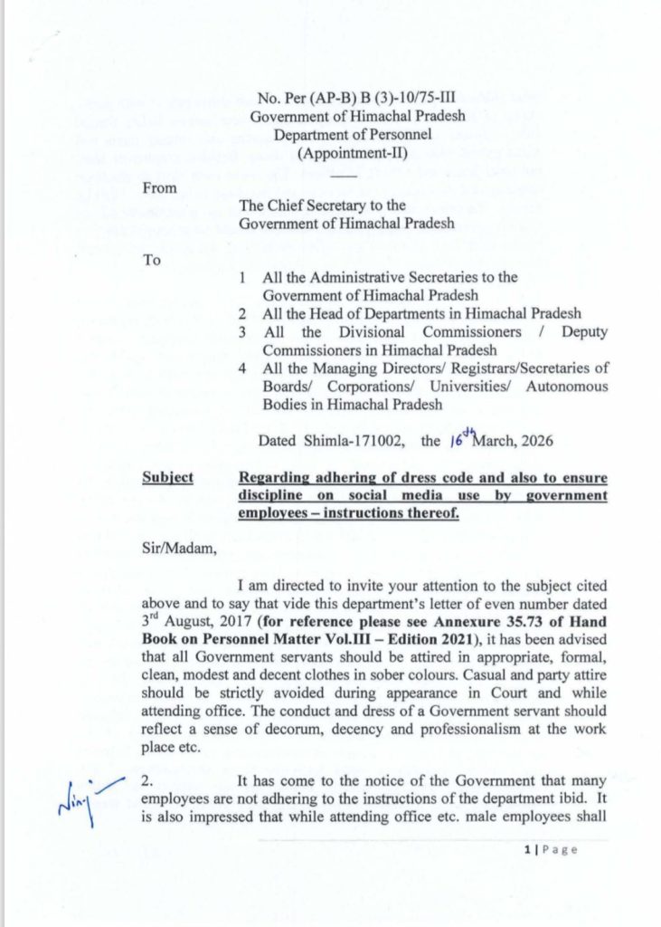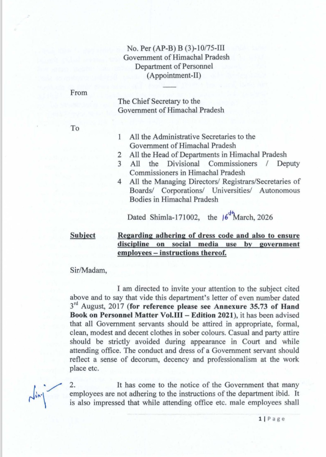 शिमला : हिमाचल सरकार ने सरकारी कर्मचारियों के लिए ड्रेस कोड और सोशल मीडिया के उपयोग को लेकर सख्त निर्देश जारी किए हैं। कार्मिक विभाग द्वारा जारी आदेशों में सरकार ने स्पष्ट किया कि सरकारी कार्यालयों में कर्मचारियों की वेशभूषा साफ-सुथरी, सादगीपूर्ण और पेशेवर होनी चाहिए।