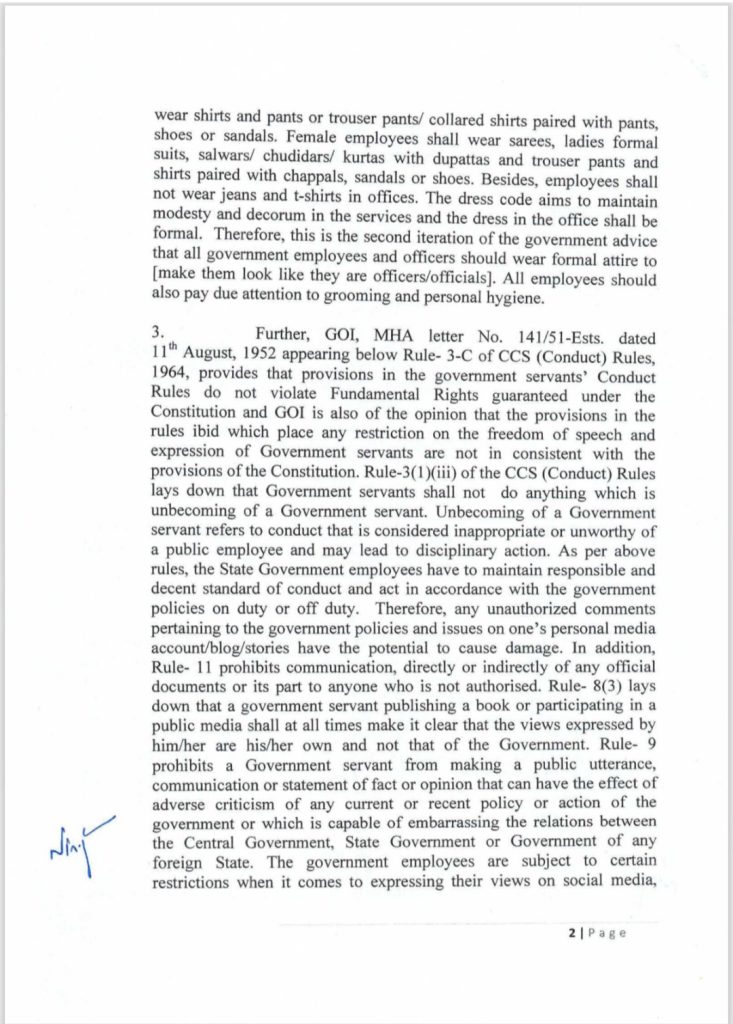 ऑर्डर में कहा गया कि कार्यस्थल पर अनुशासन, गरिमा और प्रोफेशनल छवि बनाए रखना जरूरी है। इस आदेशों के बाद पुरुष कर्मचारी ऑफिस में शर्ट-पैंट, ट्राउजर जैसे औपचारिक कपड़े पहन कर आएंगे। महिला कर्मचारियों के लिए साड़ी, सूट-सलवार-कमीज, फॉर्मल ड्रेस निर्धारित की गई।