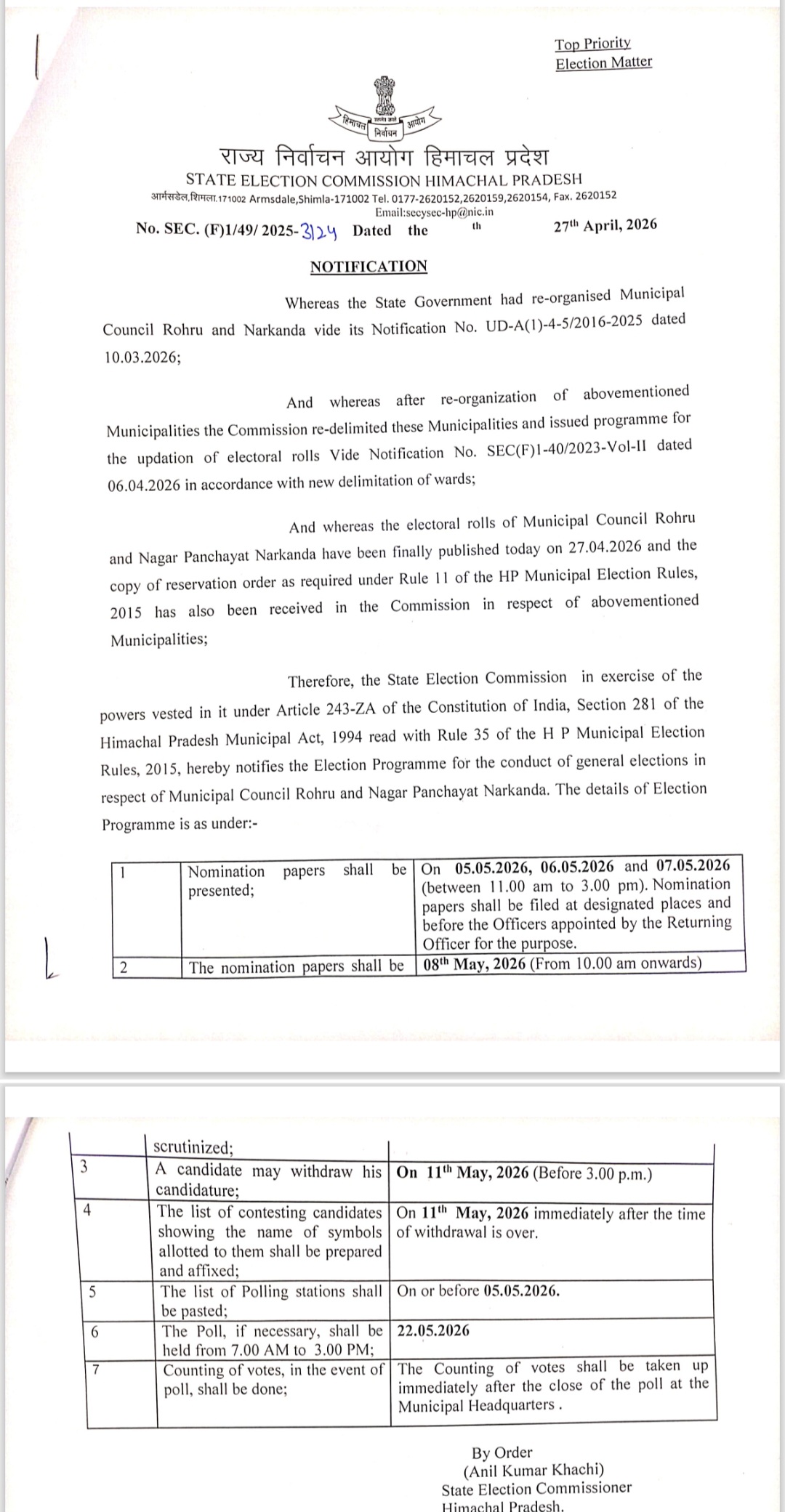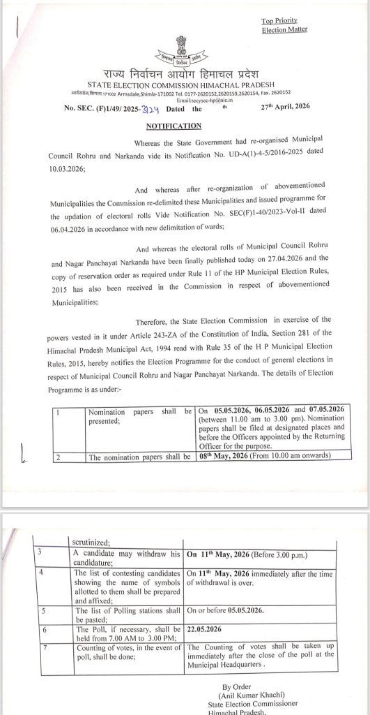 नगर परिषद रोहडू वह नगर पंचायत नारकंडा के चावन की घोषणा, जानिए कब भरे जाएंगे नामांकन और कब होगी वोटिंग