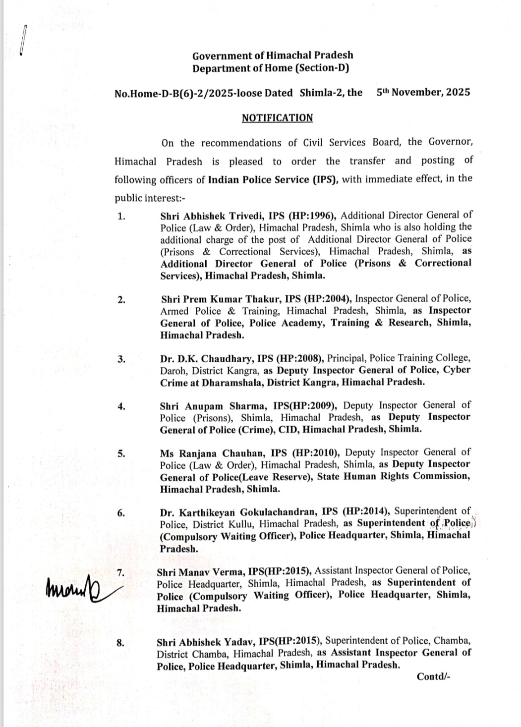 हिमाचल में पुलिस विभाग में भारी फेरबदल, 77 अधिकारियों के तबादले, 4 को अतिरिक्त दायित्व, कांगड़ा जिला सहित कई SP बदले, देखें सूची