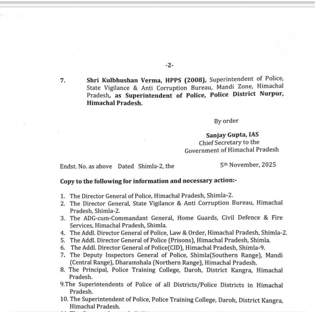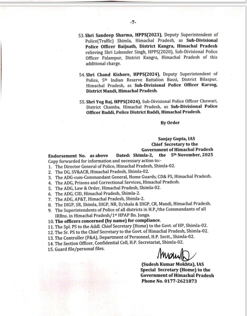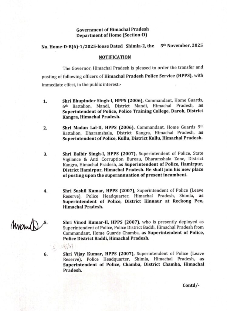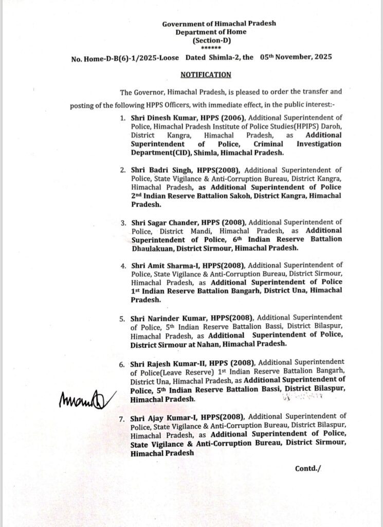 हिमाचल में पुलिस विभाग में भारी फेरबदल, 77 अधिकारियों के तबादले, 4 को अतिरिक्त दायित्व, कांगड़ा  जिला सहित कई SP बदले, देखें सूची