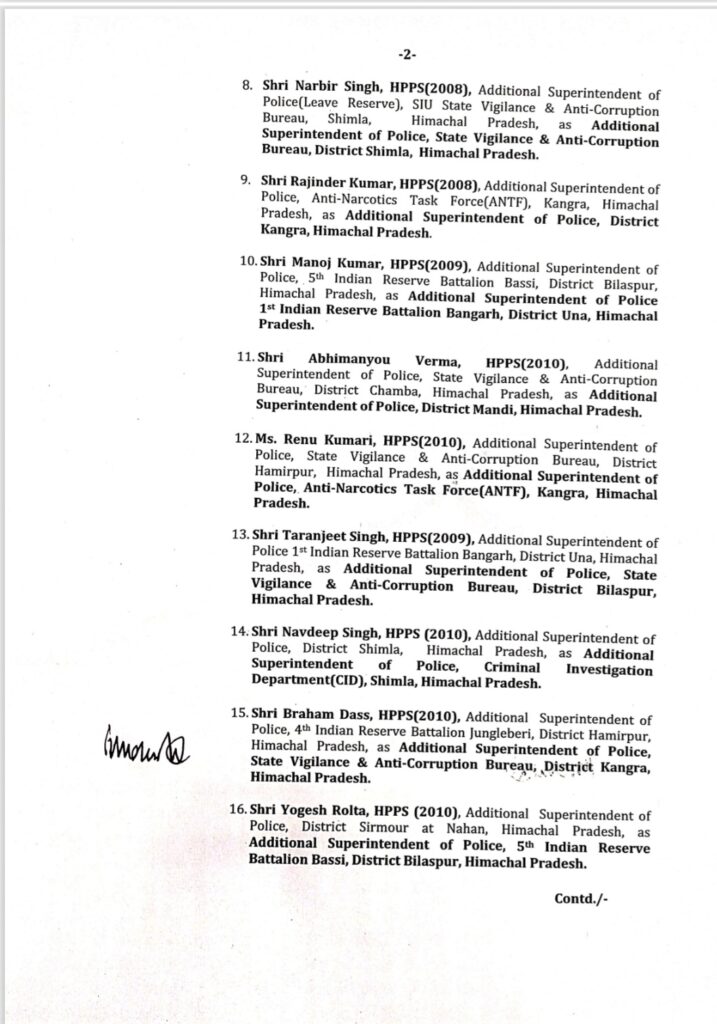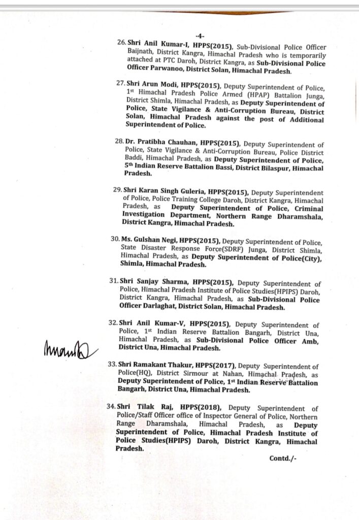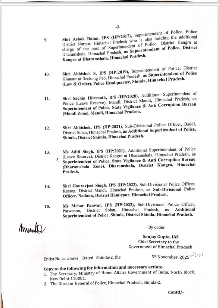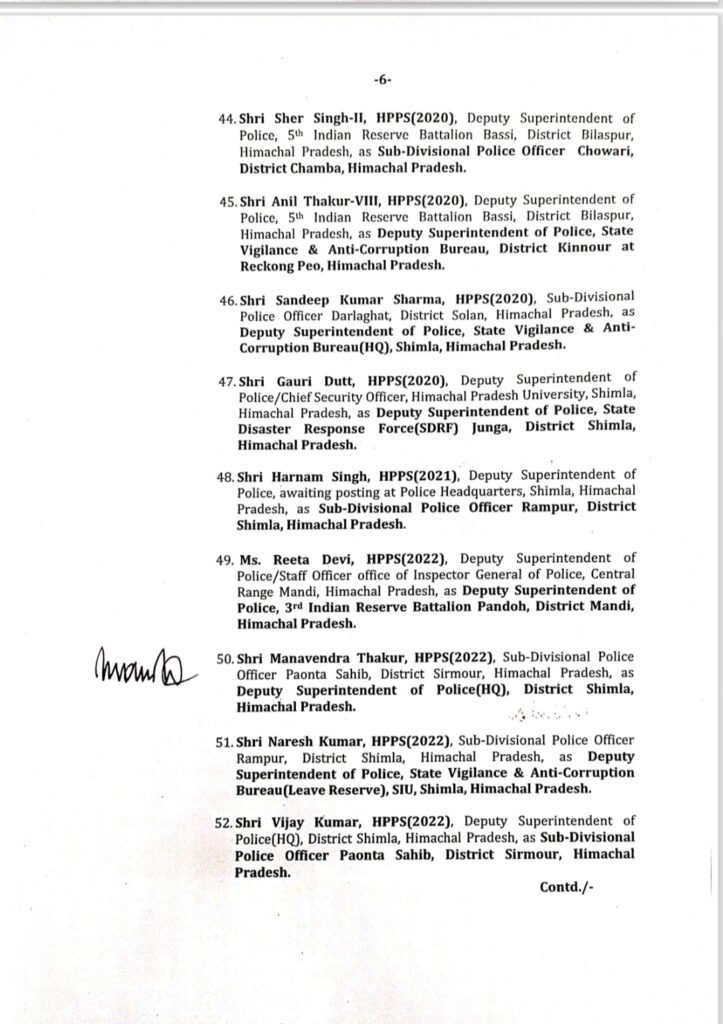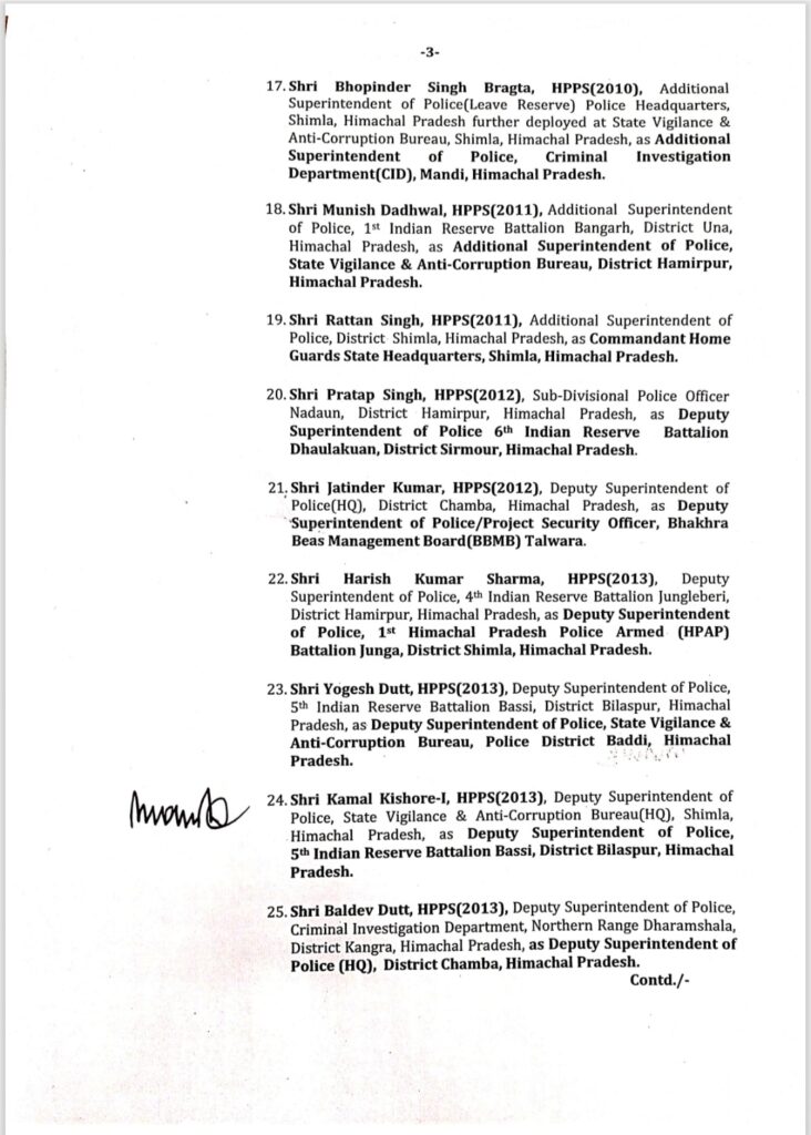 हिमाचल में पुलिस विभाग में भारी फेरबदल, 77 अधिकारियों के तबादले, 4 को अतिरिक्त दायित्व, कांगड़ा  जिला सहित कई SP बदले, देखें सूची