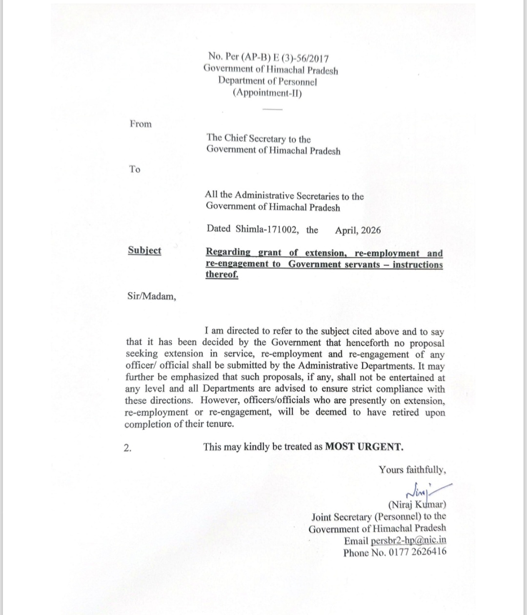 शिमला : हिमाचल प्रदेश सरकार ने सरकारी कर्मचारियों को सेवा विस्तार (एक्सटेंशन), पुनर्नियुक्ति (री-एम्प्लॉयमेंट) और पुनः संलग्नता (री-एंगेजमेंट) देने पर सख्त रुख अपनाते हुए नई हिदायतें जारी कर दी हैं। कार्मिक विभाग (अपॉइंटमेंट-II) की ओर से जारी आदेशों के अनुसार अब भविष्य में किसी भी अधिकारी या कर्मचारी के लिए सेवा विस्तार अथवा पुनर्नियुक्ति के प्रस्ताव स्वीकार नहीं किए जाएंगे।
