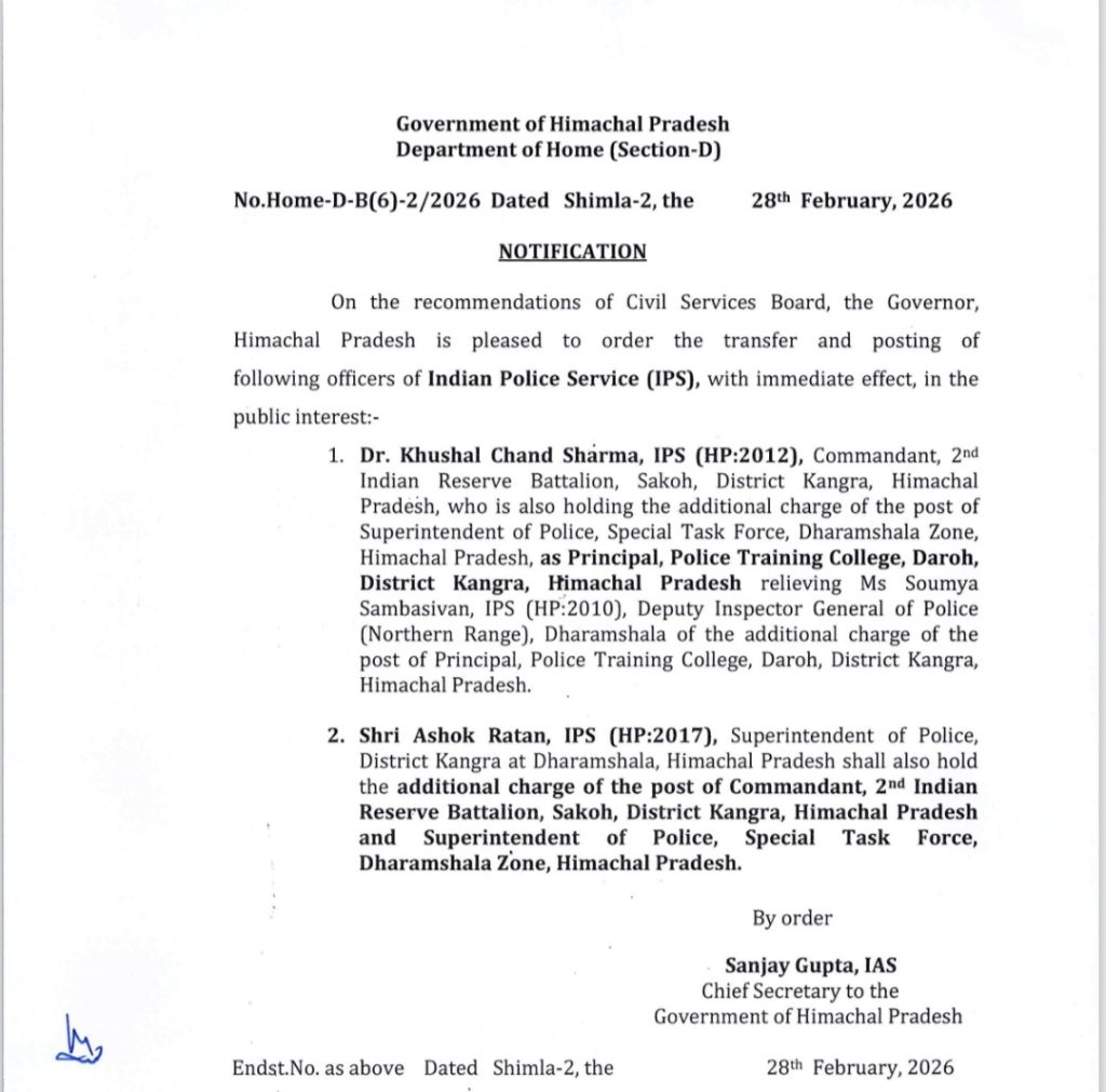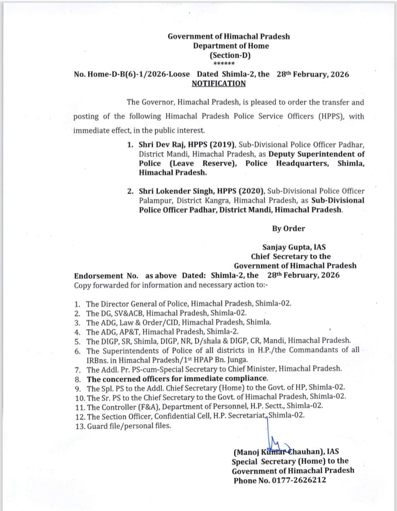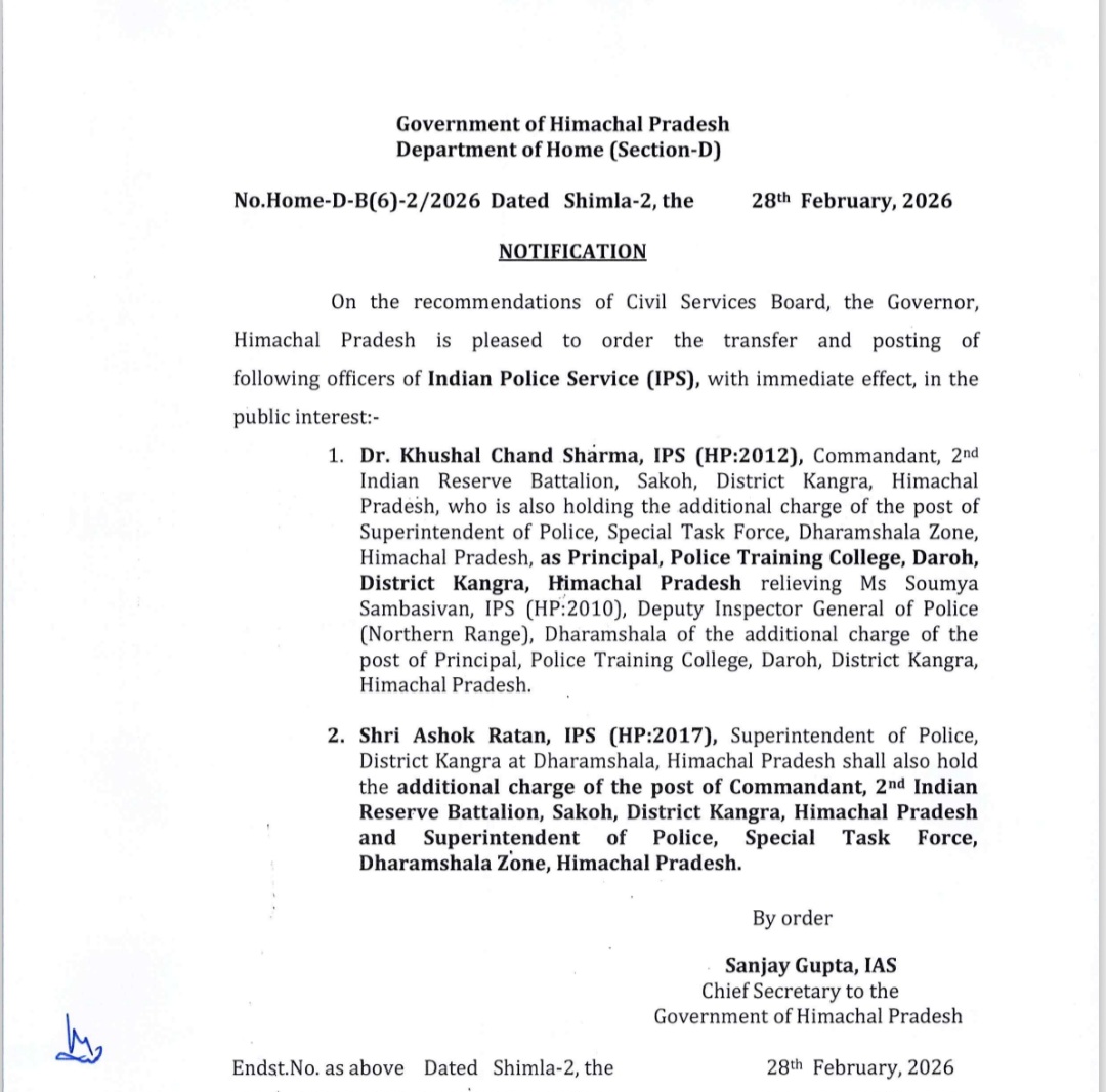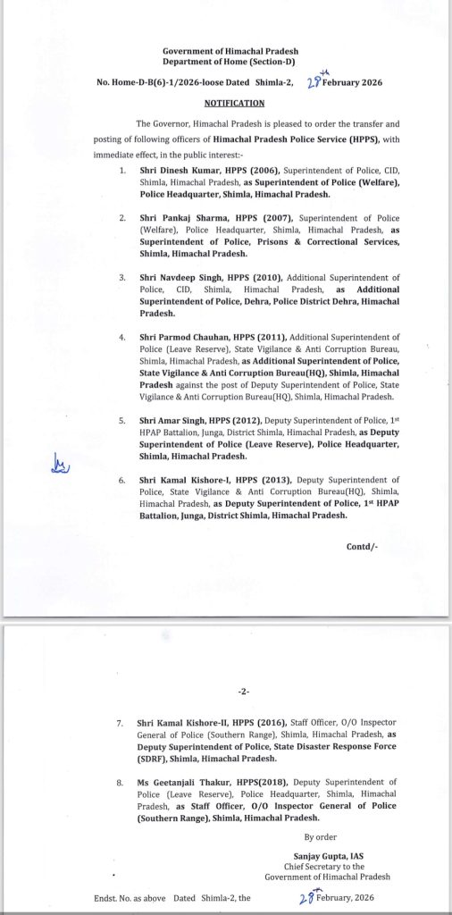 पुलिस अधिकारियों (IPS and HPS) के तबादले, एक IAS को अतिरिक्त कार्यभार, देखें किसे कहां लगाया