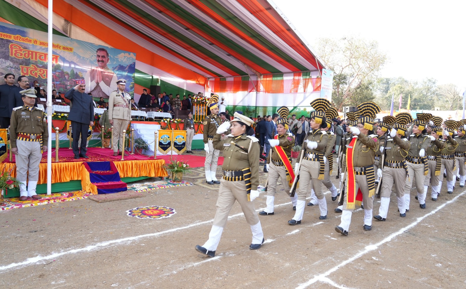 शिमला : मुख्यमंत्री ठाकुर सुखविन्द्र सिंह सुक्खू ने आज कांगड़ा जिले के प्रागपुर में आयोजित 56वें पूर्ण राज्यत्व दिवस समारोह के दौरान हिमाचल प्रदेश के लोगों को शुभकामनाएं दीं। यह प्रागपुर में आयोजित पहला समारोह था। मुख्यमंत्री ने राष्ट्रीय ध्वज फहराया और परेड टुकड़ियों से सलामी ली। परेड का नेतृत्व परेड कमांडर आईपीएस अधिकारी तरुणा ने किया। परेड में आईआरबीएन जंगलबैरी, आईआरबीएन सकोह, आईआरबीएन पंडोह, पुलिस जिला नूरपुर, होमगार्ड महिला बटालियन धर्मशाला, होमगार्ड पुरुष और महिला बटालियन धर्मशाला, एसडीआरएफ पंडोह, धर्मशाला ट्रैफिक पुलिस, वन मित्र, एनसीसी राजकीय महाविद्यालय ढलियारा, स्काउट्स एंड गाइड्स और अन्य इकाइयों ने भाग लिया।